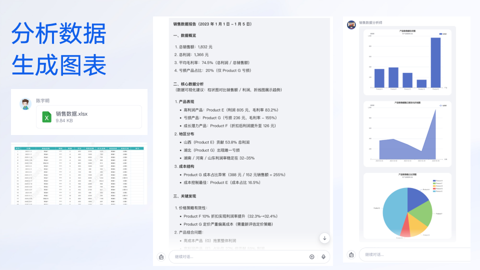 一键上传表格文件,自动完成多维度智能分析,提供数据优化建议与可视化图表。