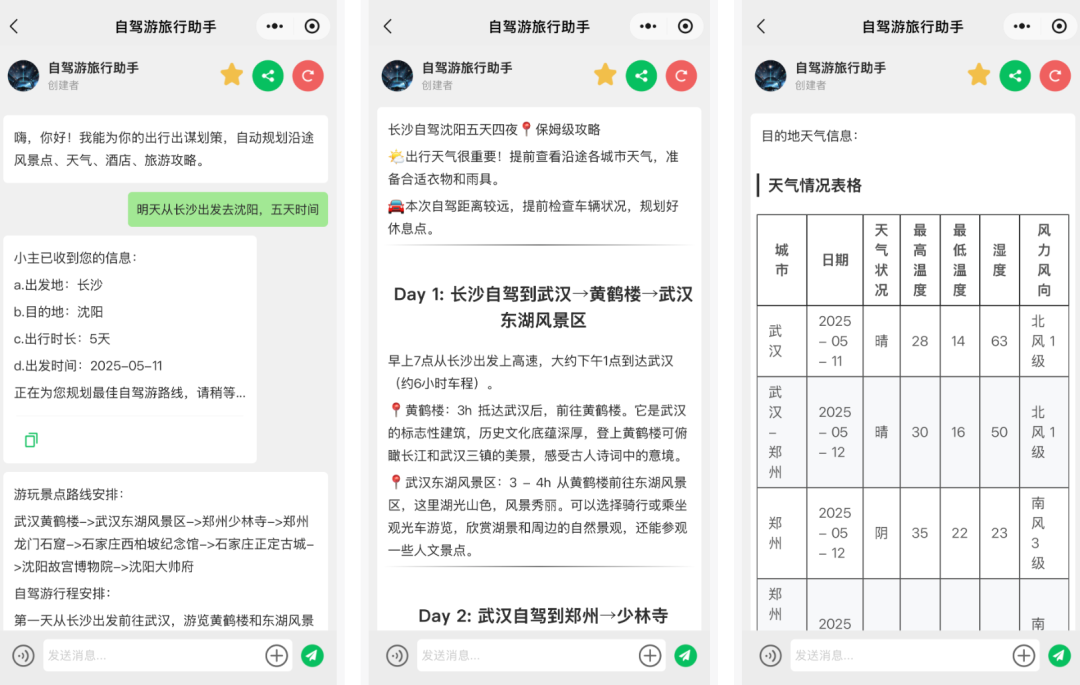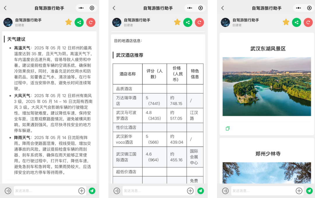 那么如果是一个自驾游的AI智能体,我们可以看到它给的方案非常详细,收到消息后马上回回复你的信息,然后给出旅游线路规划,给完之后回给出详细的景点游玩方案,然后还会给出天气、酒店情况这个都是根据你所在的日期和城市给出实时的数据,最后还会给到景点照片,甚至如果需要的话还可以做抖音视频游玩攻略视频推荐,我们根据自己的设定去做很多事情。