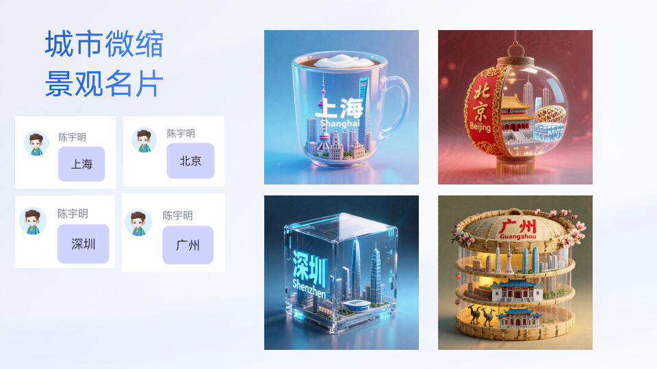 输入城市名称,一键生成该城市地标的微缩景观图片,并支持切换多种艺术造型。