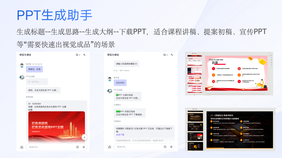 输入主题或文档,即可智能起草内容大纲,并一键生成完整的PPT文件,支持多种模板风格随心切换。