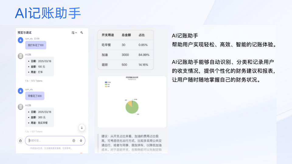 支持通过一句话或一张图片自动识别消费类型与金额,并为您生成月度财务报告与优化建议,同时提供清晰的数据分析图表,高效管理资产。