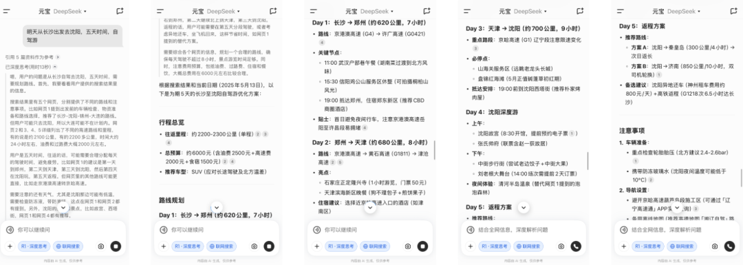 比如我让DeepSeek做了个自驾游规划【明天从长沙出发去沈阳,五天时间,自驾游】。