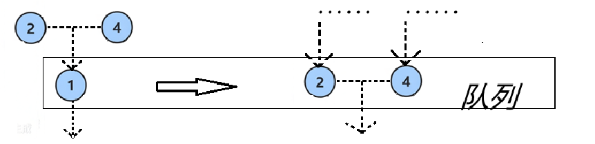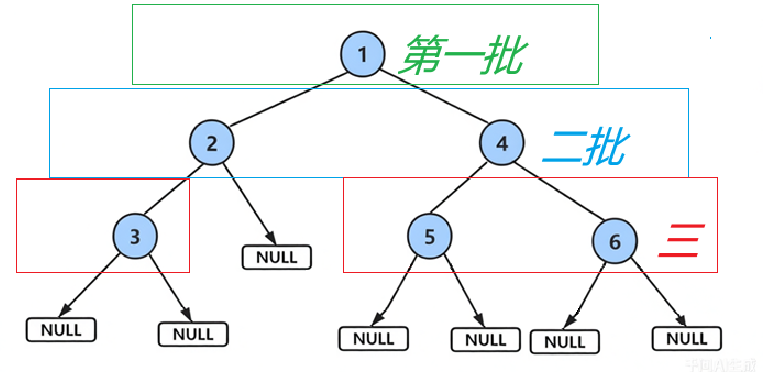 1 入队。1 出队后,其左右子节点 2 和 4 入队。2 出队后,其左子节点 3 入队;4 出队后,其左右子节点 5 和 6 入队。<操作流程> 初始状态:队列为空 步骤1:将根节点 1 入队 → 队列: [1] ↓ 步骤2:取出 1,打印并将其子节点 2, 4 入队 → 队列: [2, 4] ↓ 步骤3:取出 2,打印并将其子节点 3 入队 → 队列: [4, 3] ↓ 步骤4:取出 4,打印并将其子节点 5, 6 入队 → 队列: [3, 5, 6] ↓ 步骤5:取出 3,无子节点 → 队列: [5, 6] ↓ ...
