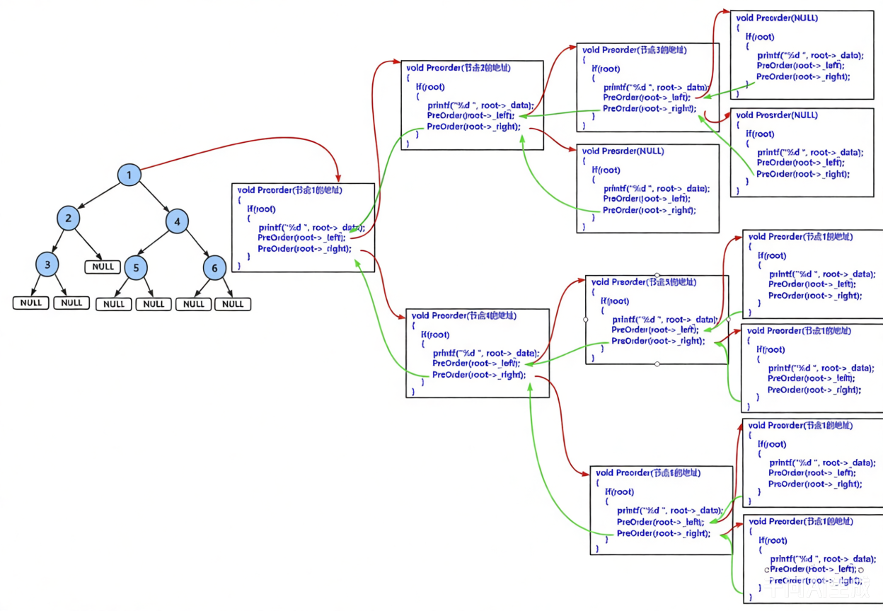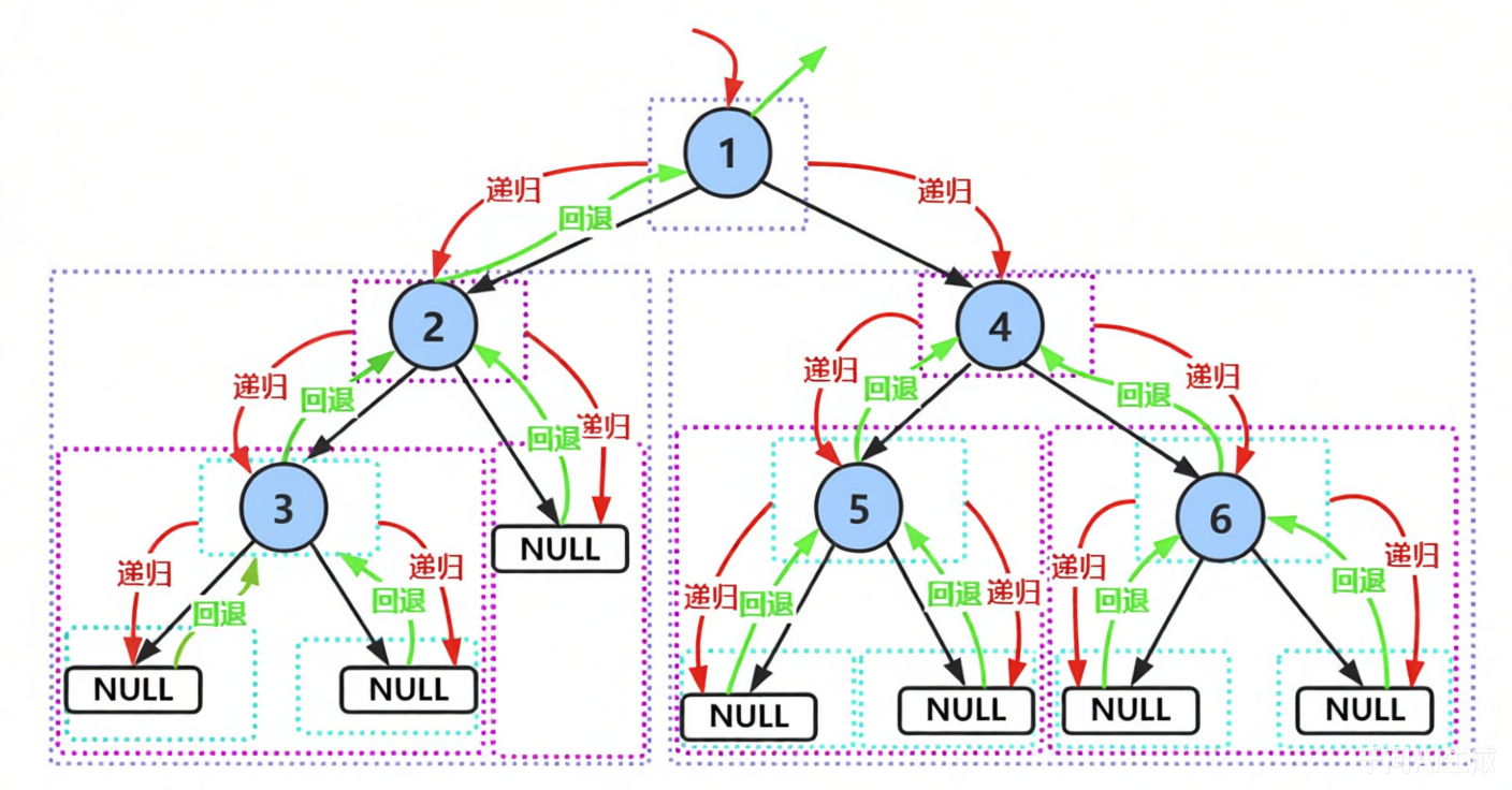 如图详细解释了前序遍历递归调用的过程。