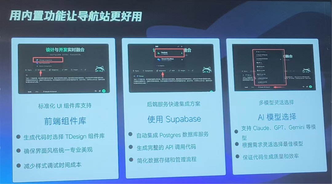 (3)一些来自实践的启发。下午场分享嘉宾从自身实践分享了一些很棒的功能,比如:使用标准组件库来控制AI生成前端的风格一致行、与云服务集成实现开发部署一体化等。