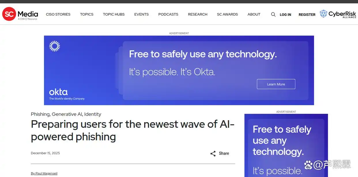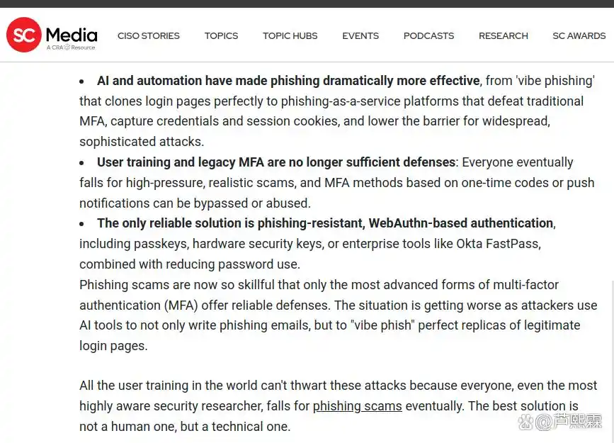 网络钓鱼长期被视为社会工程攻击的主要载体。过去二十年中,防御策略主要围绕两个维度展开:一是技术层面的邮件过滤、URL信誉与页面仿冒检测;二是人员层面的安全意识培训,强调识别拼写错误、可疑发件人地址或非官方链接等显性特征。然而,随着生成式人工智能(Generative AI)技术的成熟,攻击者已能自动化生成高度逼真的钓鱼内容,不仅在视觉上复刻目标品牌的UI/UX,在语言风格上亦可精准模仿特定组织内部的沟通语境,形成所谓“氛围钓鱼”(vibe phishing)。