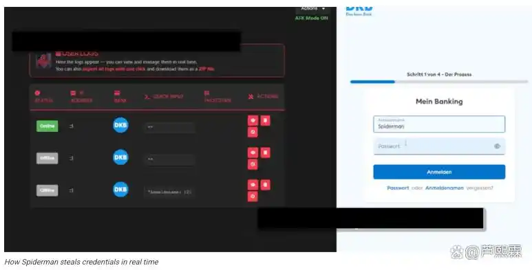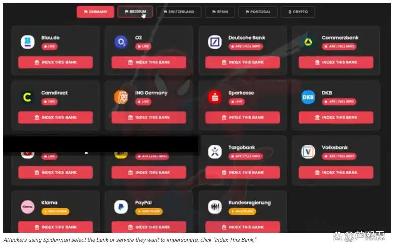 Spiderman套件的核心是一个基于PHP与MySQL构建的Web管理后台。攻击者登录后可选择预置的“目标品牌”(如Chase、HSBC、Revolut、Coinbase),系统自动加载对应的品牌资源包,包括Logo、配色方案、字体及页面布局。控制台界面如下所示(简化示意):
