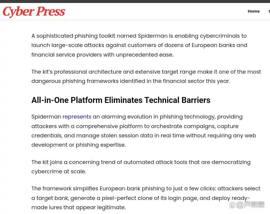 Spiderman钓鱼套件代表了现代金融钓鱼攻击的典型范式:高度模块化、多语言适配、反检测强化,并向Web3领域延伸。其“即服务化”运营模式使得攻击者无需具备深厚技术背景即可发动大规模、高仿真度的欺诈活动。尤其值得关注的是,DeFi钓鱼模块通过滥用智能合约授权机制,实现了无需密码的资产盗取,对传统安全边界构成根本性挑战。