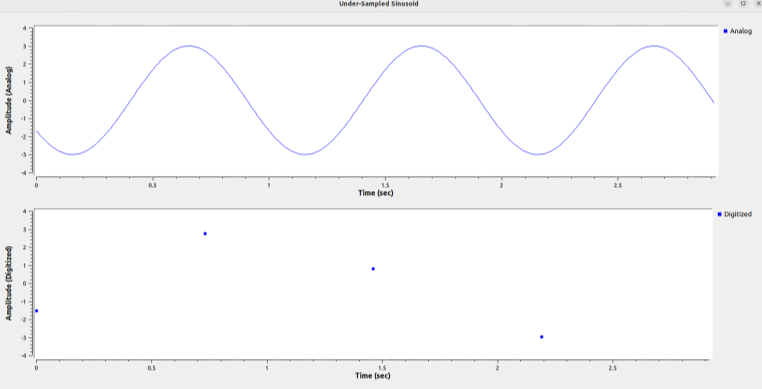 上图我们看过了正弦波采样率比较高的情况,即使通过散落的点我们也可以看出来是一个正弦波,但是如果像下图采样率太低,遗失了太多的信息,就基本看不出来原始波形了