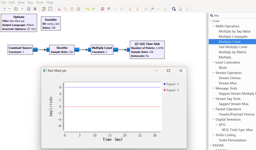 接下来尝试一个最简单的乘法运算,搜索 Multiply Const 拖拽到流程图中,放在 Throttle 后面,设置参数 Constant 为 2,执行流程图可以看到此时波形是固定值 6,我们通过一个乘法模块将原来的 3 乘了 2,这是 GNU Radio 的一个简单的操作,但是却是我们第一次在 Source 和 Sink 之间执行了数学运算,接下来会在 Source 和 Sink 之间塞各种有趣的模块来实现信号调制解调