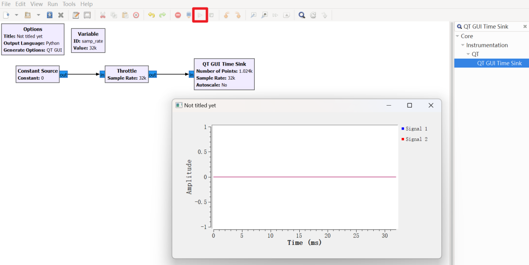 首先来创建一个恒定数值的波形,直接拖拽一个 Constant Source,然后添加一个 Throttle 模块,最后放一个 QT GUI Time Sink,把它们连接起来,点击运行按钮可以看到一个始终为 0 的波形