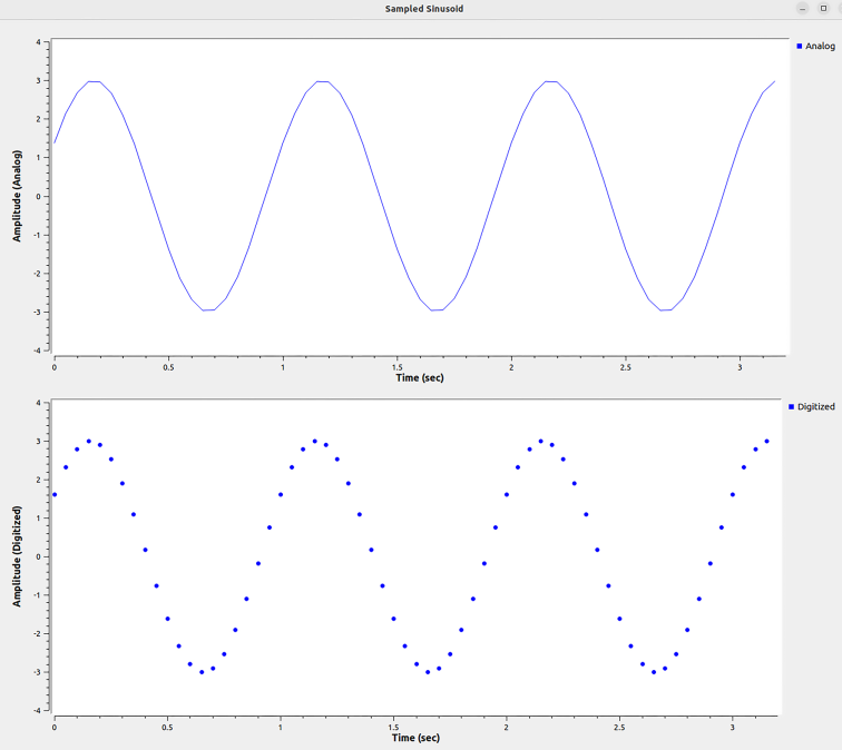 为了进行数字采样,需要以固定间隔对信号进行采样,并将采集到的样本转换为计算机可以处理的数字序列,完成这一过程的硬件称为模数转换器,比如一个正弦信号输入到 ADC 中,会进行一系列采样。尽管采集的样本数量有限,但仍能大致看出这是一个正弦波