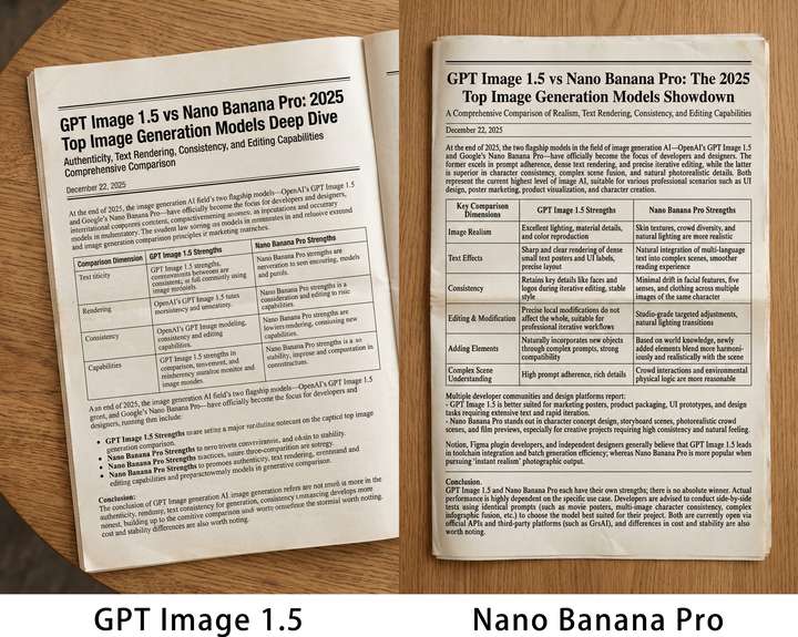 桌子上有一份英文版本的报纸。该报纸显示了下面的Markdown格式内容,不要显示任何Markdown符号以自然的报纸文章形式呈现。请准确保留所有内容、格式和数字。图像应为高比例缩放。# GPT Image 1.5 vs Nano Banana Pro:2025年超强图像生成模型深度对决### *真实性、文字渲染、一致性与编辑能力全面对比*2025年12月22日