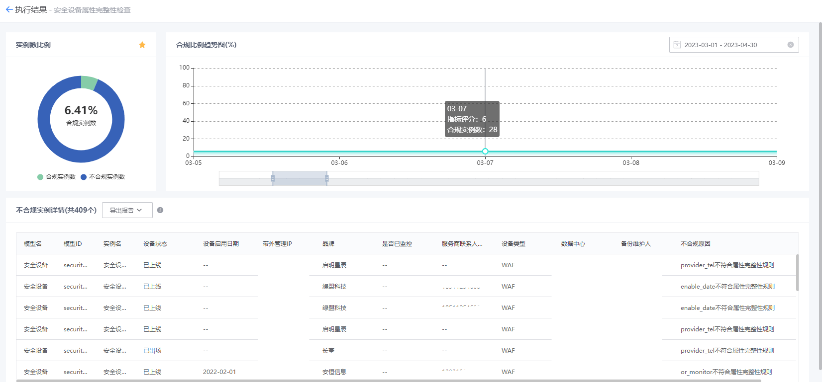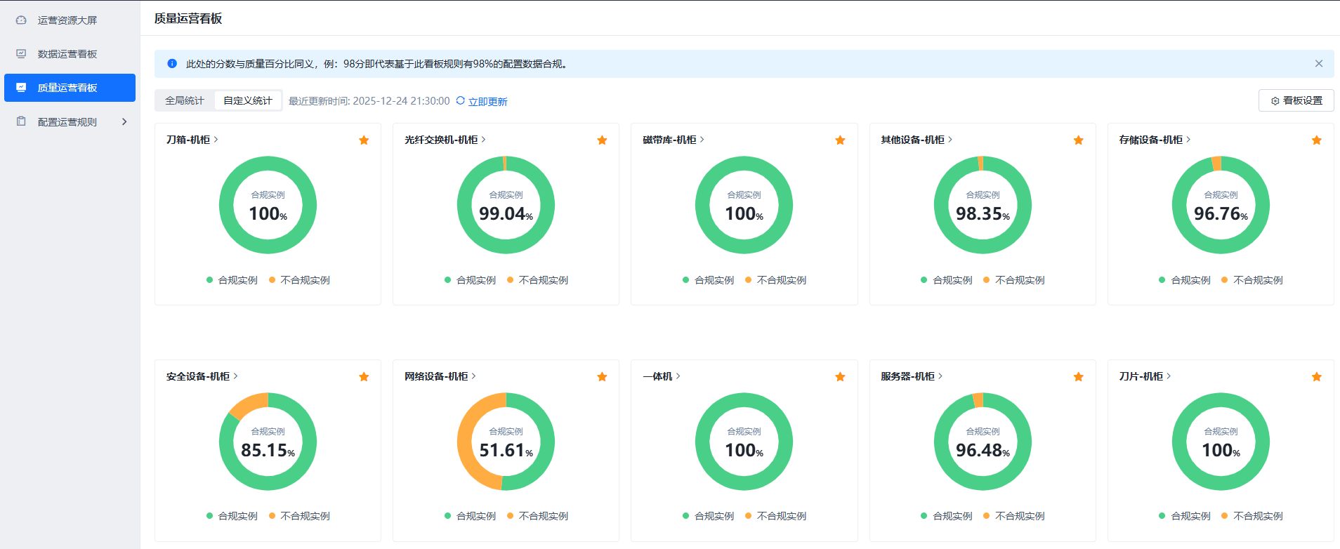 功能介绍:质量运营看板实时展现通过运营审计规则执行的结果,相对直观的看到各板块审计情况,便于进一步对数据进行分析和挖掘,了解底层用户数据维护行为,并为工作部署及相应策略提供数据依据。