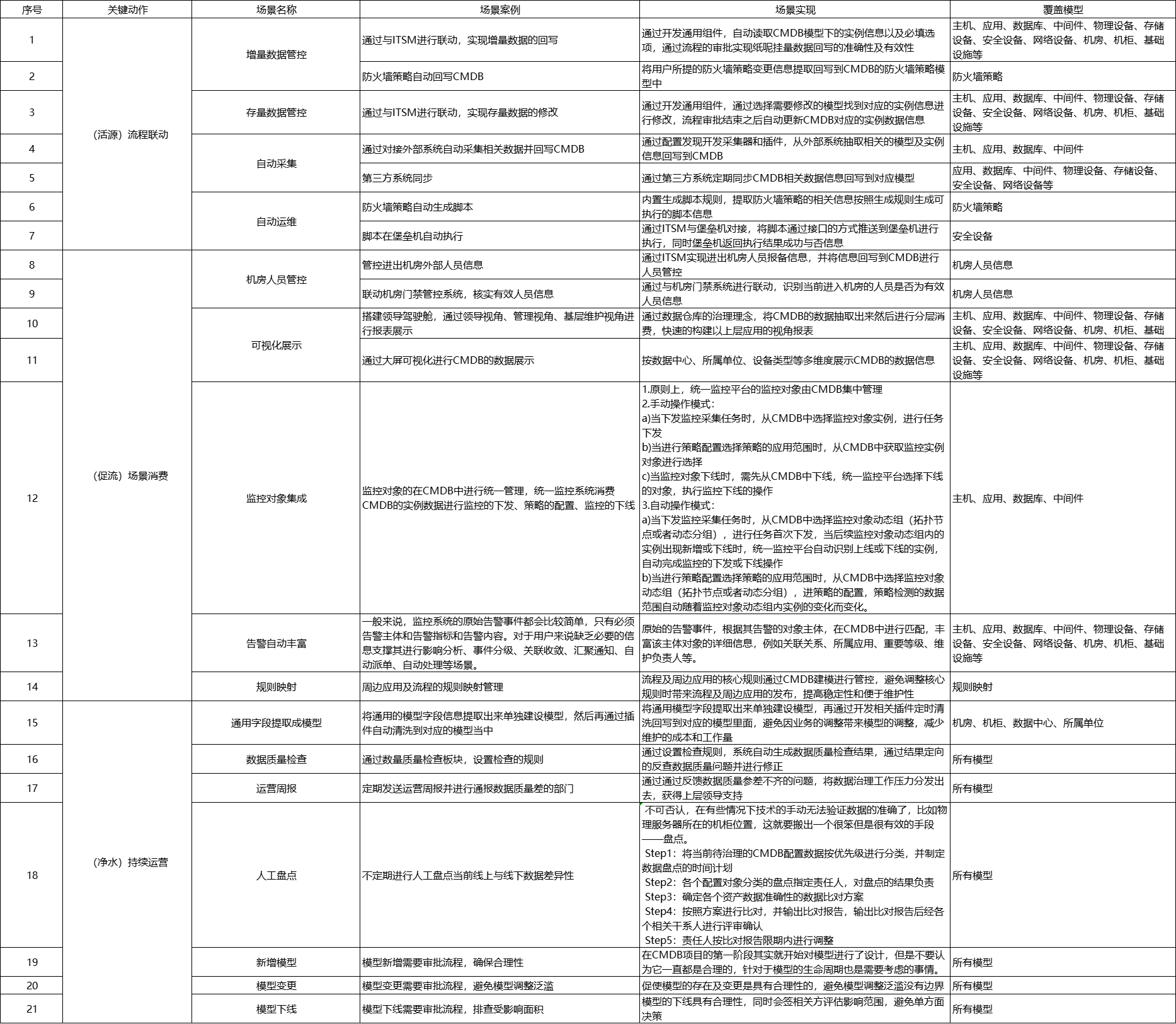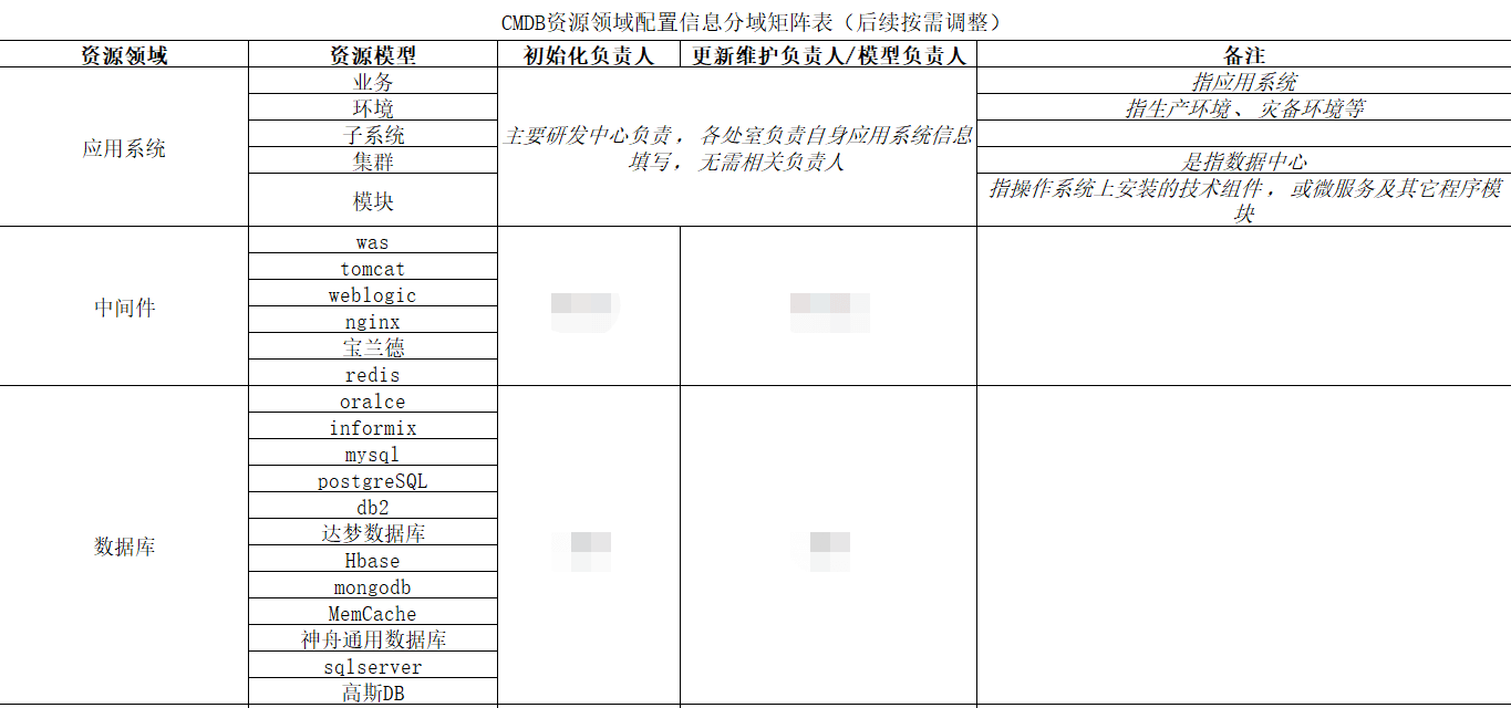 基础数据量上来之后,在关注上层业务场景建设的同时,开始关注底层的数据治理,坚持“谁的数据谁负责”思想,并在此过程中梳理CMDB资产领域配置信息分域矩阵表,明确模型管理主责人。