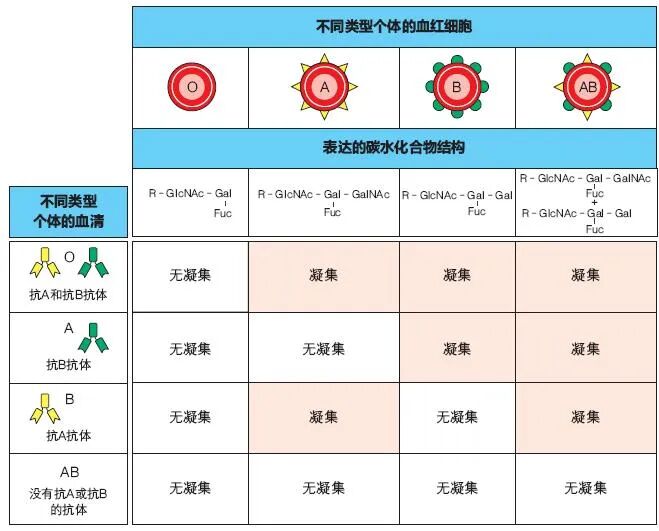 图1:血球凝集法用于血型分类和匹配供者和接受者输血.普通肠道细菌会携带与血型抗原相似或相同的抗原,这些抗原会刺激机体产生特异性抗体,这些抗体针对的抗原是机体自身红细胞上不存在的抗原。因此,O型个体虽缺乏A和B抗原,但可以具有抗A和抗B抗体,而AB型个体则没有抗A和抗B抗体。含有抗A和抗B抗体的输血供体或接受者的红细胞凝集模式揭示了个体的ABO血型。在输血前要对接受献血者的血清进行测试,检查是否存在使供体红细胞凝集的抗体,反之亦然,这称为交叉匹配的程序,该流程可以用来检测不属于ABO系统的、潜在的有害抗体。
