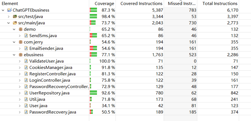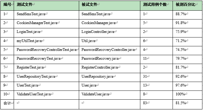 SendSms.java单元测试覆盖率由原来的65.2%提升到88.7%;User.java单元测试覆盖率由原来的34.1%提升到97.6%;PasswordRecovery.java单元测试覆盖率由原来的50.5%提升到79.7%,并且产品代码的单元测试覆盖率也由原来的73.7%提升到81.5%。