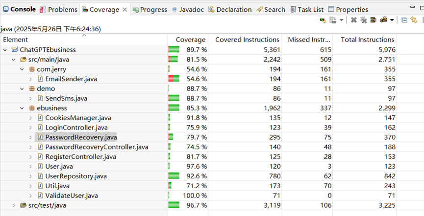 产品代码总的测试覆盖率为87.3%,其中ValidateUser.java的测试覆盖率最高,为100%,而User.java和PasswordRecovery.java的测试覆盖率比较低,分别为34.1和50.5%。下面重新对User.java和PasswordRecovery.java生成一次单元测试用例。