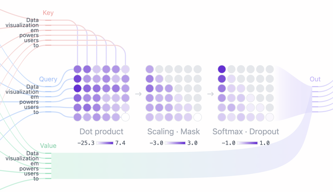 表示 Token 对 Token 的关注程度,所有 的权重之和为 1,这一步是一个去噪和聚焦的过程,过滤掉不相关的 Key,高亮匹配度高的 Key。