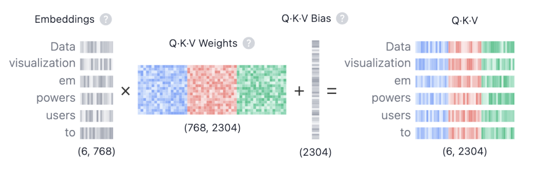 Self-Attention 层中,输入向量序列 (例如词嵌入加上位置编码)并不直接参与计算,而是首先通过三个独立的线性变换矩阵 、、 映射到三个不同的子空间。