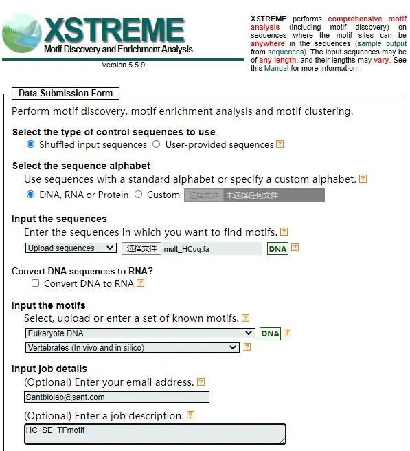 TCGATCGATCGA...这个 SE.fasta 文件即可作为输入,上传至MEME suite进行下一步分析。