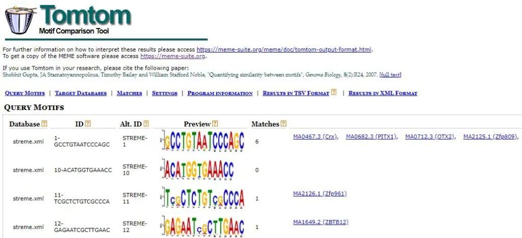 在输出文件中,没有xstreme_tomtom_out文件夹,只有streme_tomtom_out、meme_tomtom_out两个文件夹,里面有TSV格式表格文件与html网页文件。网页文件如下