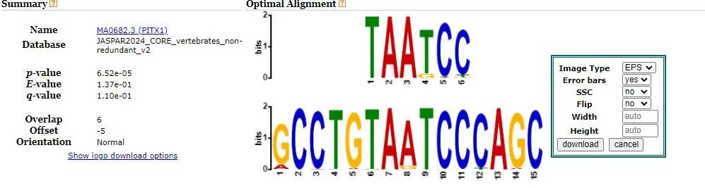 Similar Known Motifs | 与已知转录因子 motif 的相似性 | 通常是 TOMTOM 比对结果,格式如:MA1516.2 (KLF3) [q=0.02]表示该新 motif 与 JASPAR 中 KLF3 的结合谱高度相似,且 q-value = 0.02(显著)。这是功能注释的关键:告诉你“这可能是哪个 TF 的结合位点”。 |