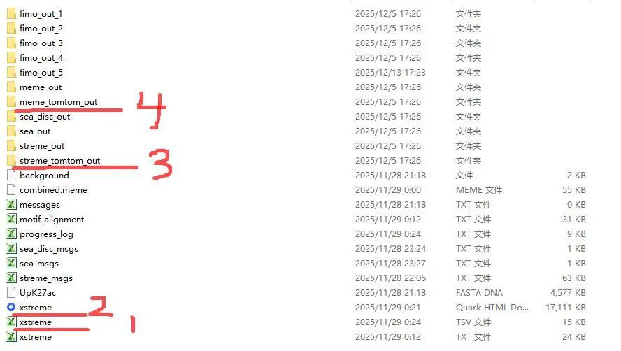 progress.log:记录分析过程中的关键步骤和时间戳,便于追踪分析进度和调试问题。sea_msgs.txt / streme_msgs.txt:分别记录SEA和STREME模块的运行日志,包含警告、错误或重要提示信息。