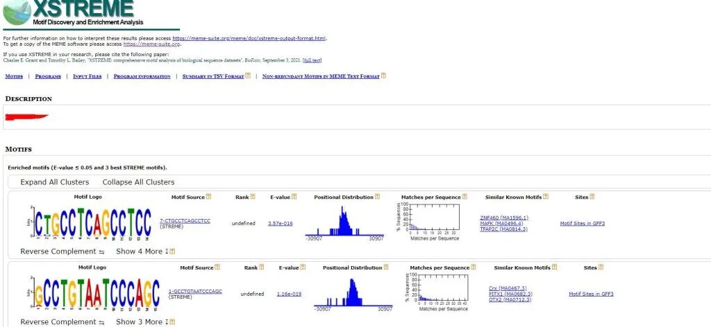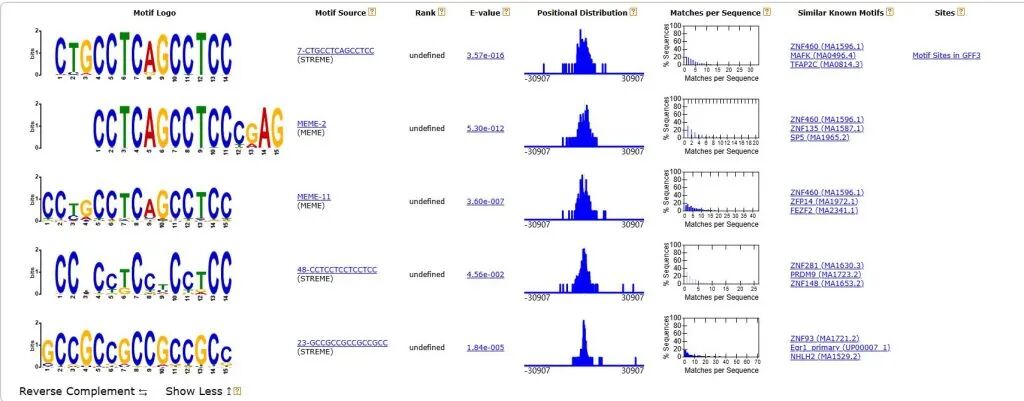 show more选项:一个motif可能有相似的motif序列,并且是来自MEME或者STREME分析结果,并按照E-Value值的显著性排列。并给出每一个类似motif的最相关的top3已知的转录因子motif。