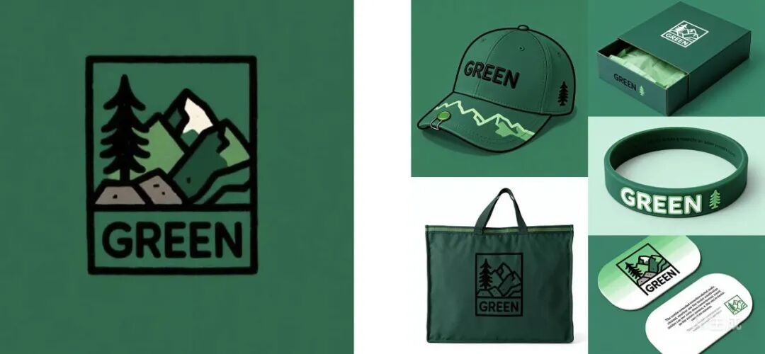 提示词:参考这个LOGO,做一套户外运动品牌视觉设计,品牌名称为“GREEN",包括包装袋、帽子、纸盒、卡片、手环、挂绳等。绿色视觉主色调,趣味、简约现代风格