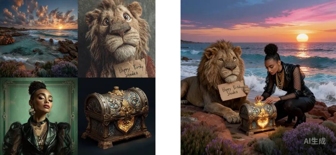 提示词:图1为画面背景,图2中狮子爬在图3人物旁边,图3人物蹲在海边研究图4中的箱子,巧妙的将4张图片合成至一张图片,要求画风一致,画面协调
