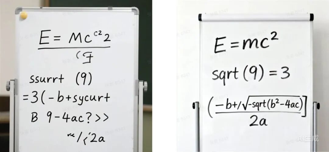 提示词:一个白板,上面写着以下方程式:E=mc^2sqrt (9) =3 (-b+/-sqrt (b^2-4ac) ) /2a