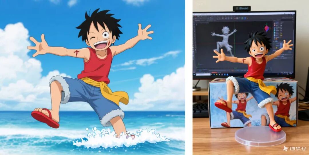 提示词:把这张照片变成一个角色人偶,保持人偶动作与图片中的一致。在它后面,放置一个印有该角色图像的盒子,以及一台屏幕上显示Blender建模过程的电脑。在盒子前面,添加一个圆形塑料底座,让角色人偶站在上面。如果可能的话,将场景设置在室内。