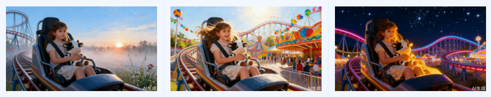 提示词:生成3张女孩和奶牛玩偶在游乐园开心地坐过山车的图片,涵盖早晨、中午、晚上