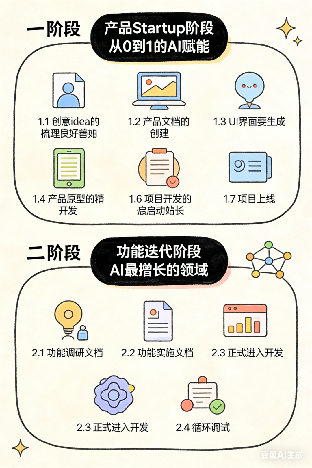 经过两个月的沉浸式vibe coding实践,我总结出了一套可靠的AI开发流程,这套流程用于应对vibe coding的这种不确定性,通过流程控制,提升我们AI编程的效果。流程将AI开发分为两个关键阶段:产品startup阶段和功能迭代阶段。