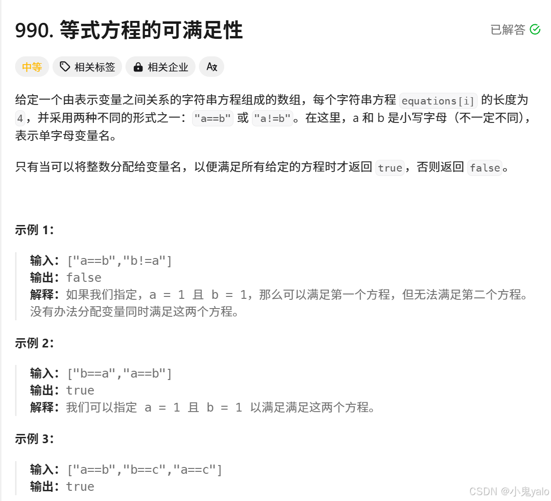 };本题链接:990. 等式方程的可满足性 - 力扣(LeetCode)
