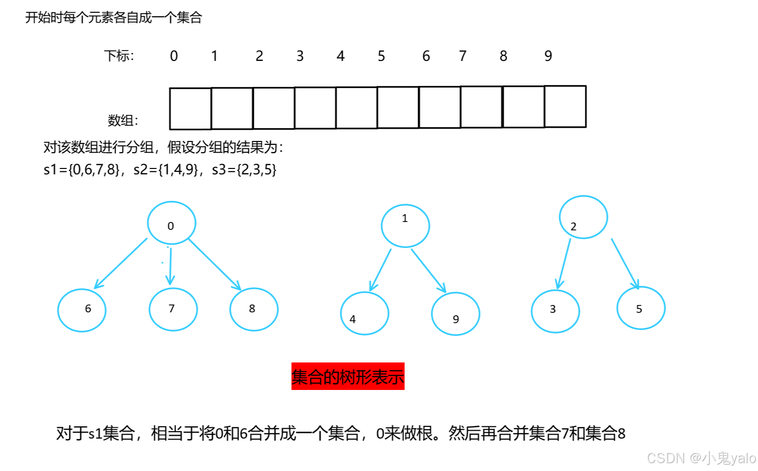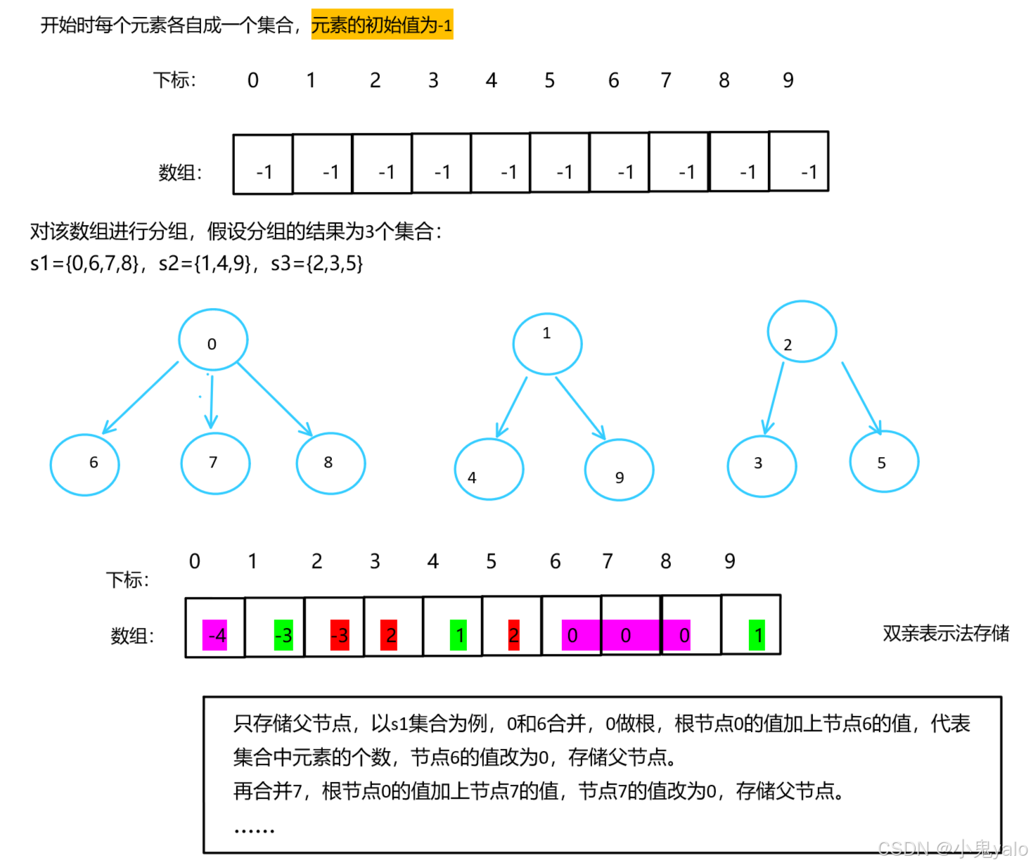 对于上图中: 节点0的数组值为-4,说明该节点为根节点。 节点6的数组值为0,说明该节点的父节点为0。 节点7的数组值为0,说明该节点的父节点为0。 节点8的数组值为0,说明该节点的父节点为0。