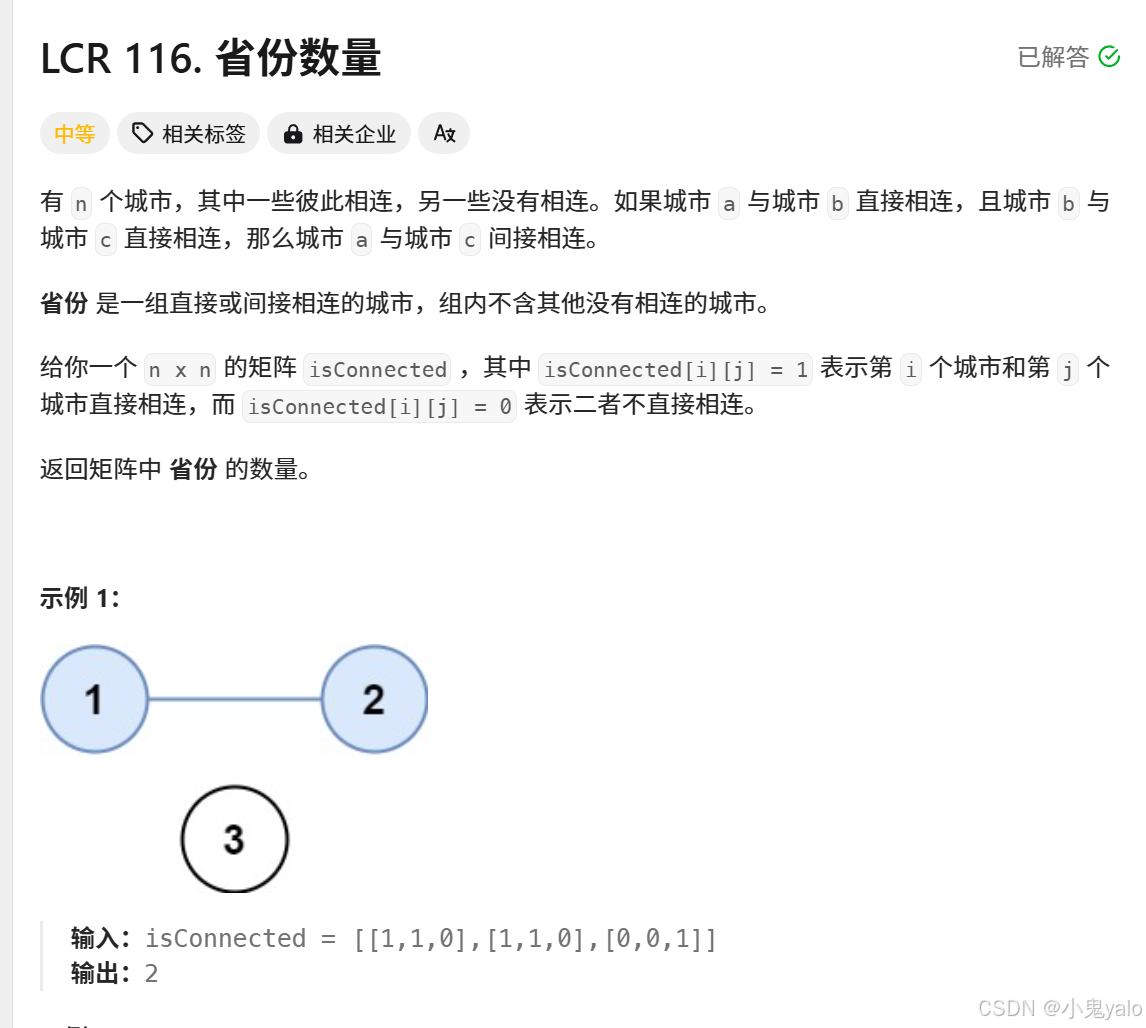 题目链接:LCR 116. 省份数量 - 力扣(LeetCode)