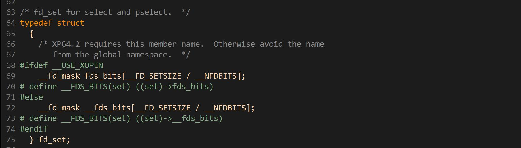 其实这个结构就是一个 整数数组,更严格的说,是一个 "位图",使用位图中的位来表示要监视的文件描述符。