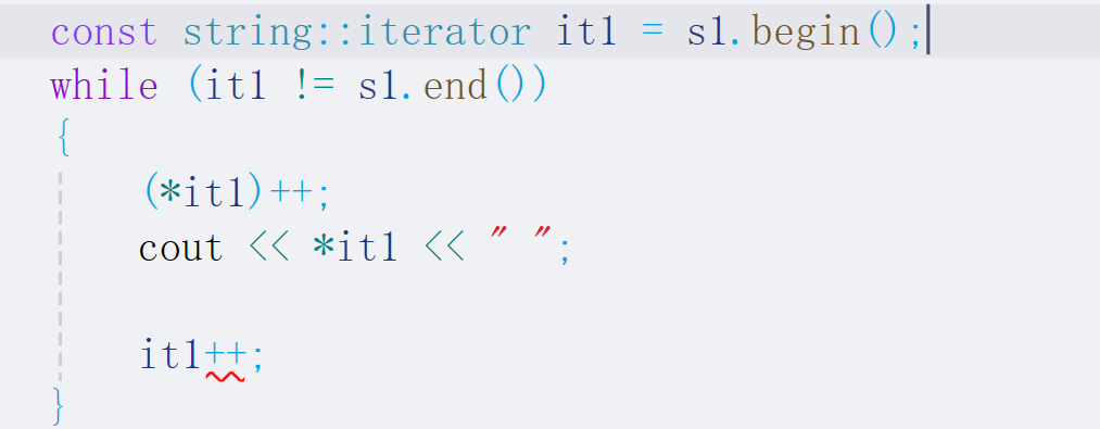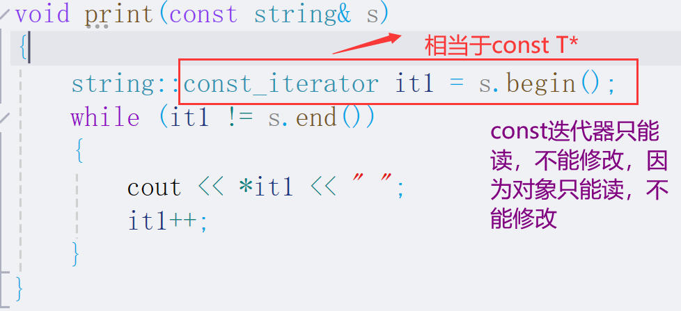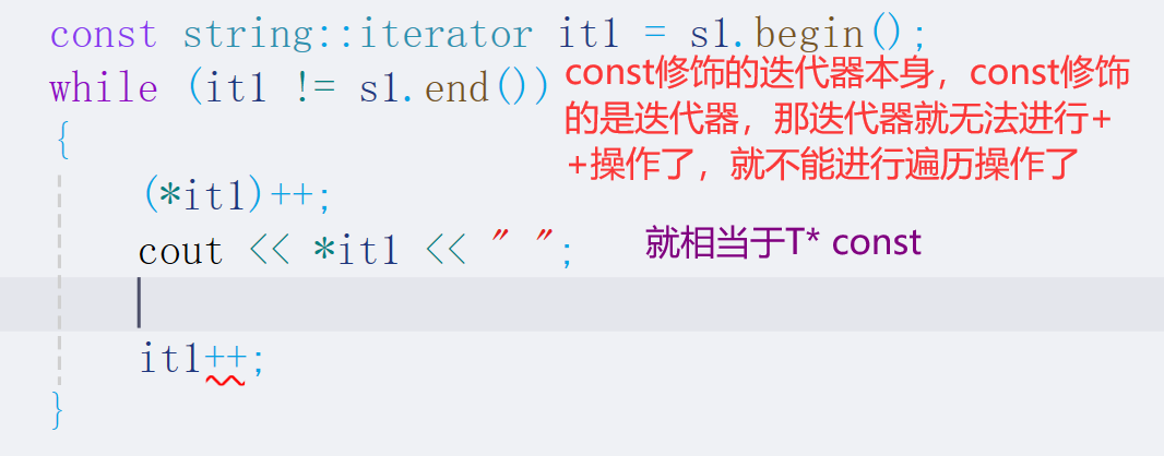 这是一种错误写法,const对象中的内容是只能读,不能被修改,而上面的迭代器中的const修饰的迭代器本身,const修饰的是迭代器,那迭代器就无法进行++操作了,就不能进行遍历操作了。