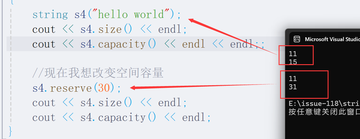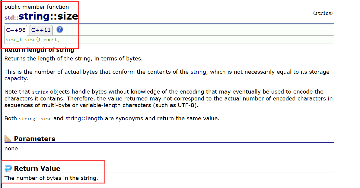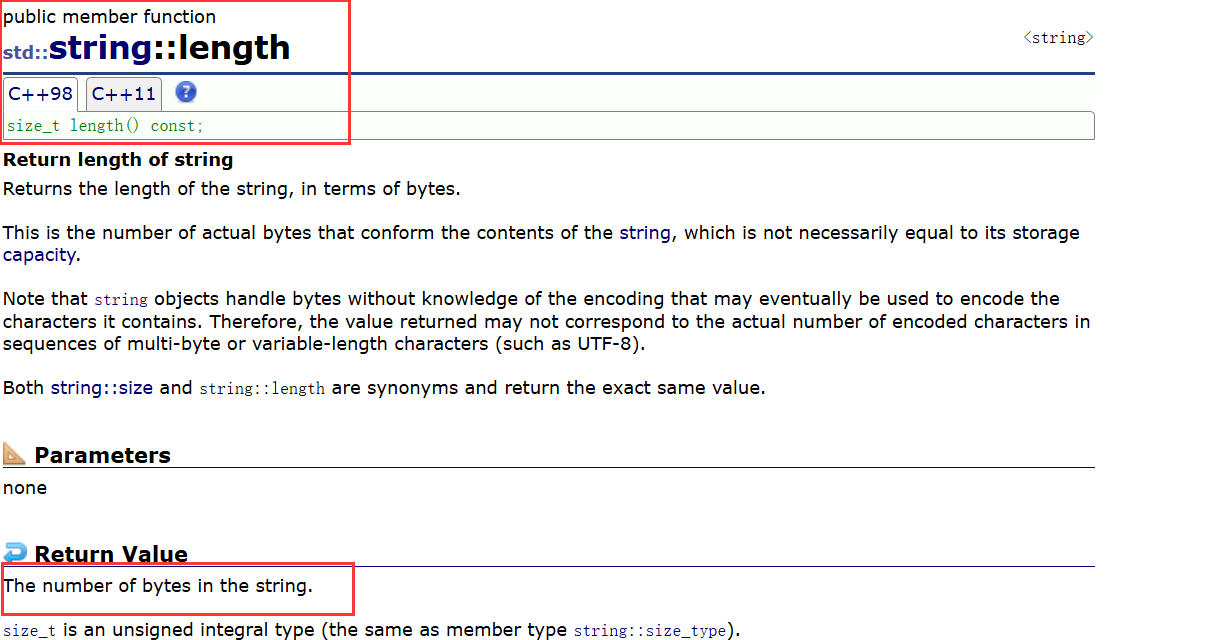 }这两种方法都返回字符串的长度,但是长度中不包含‘\0’(字符串中有‘\0’),并且推荐使用size求长度(这是因为size适用于所有求解个数,如果在二叉树中使用length求解个数,那这个length表示什么意思?这就不能一眼看出了)