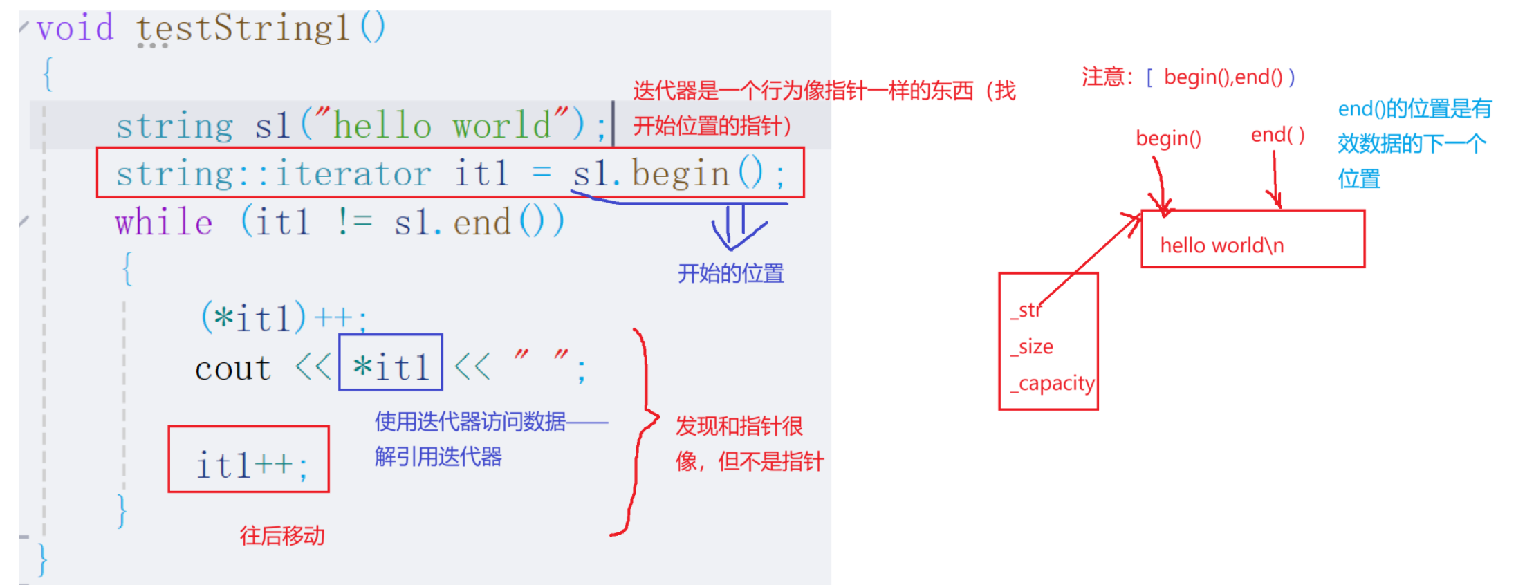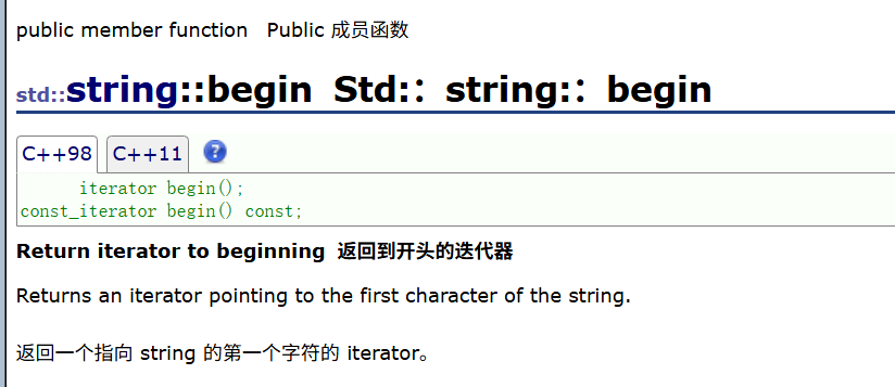 begin 是返回一个指向 string 的第一个字符的 iterator。