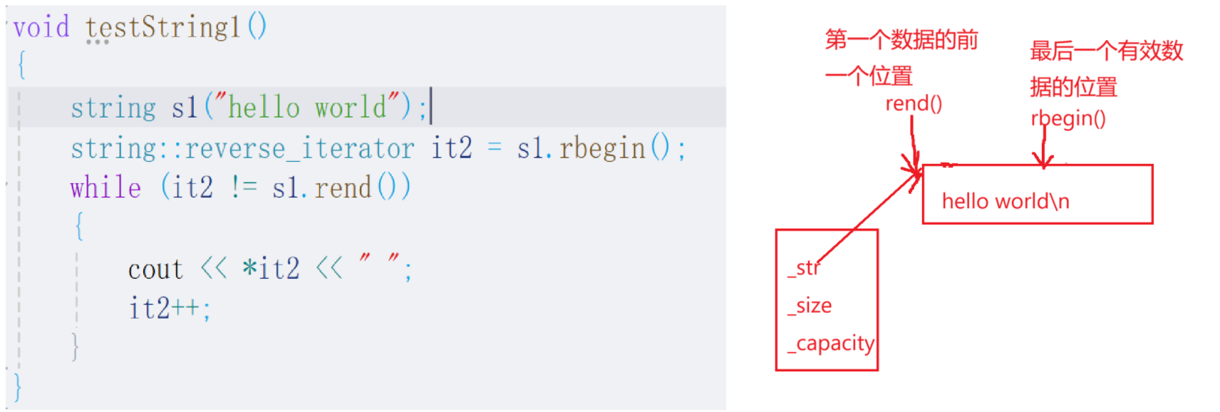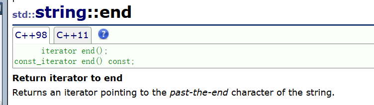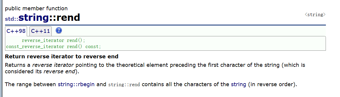 rend 返回一个 reverse 迭代器,指向 string 第一个字符 (被认为是其 reverse end) 之前的理论元素。