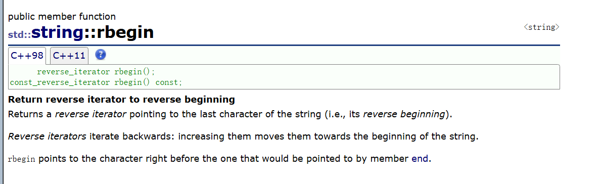 rbegin返回一个指向 string 的最后一个字符 (即其反向开头) 的 reverse 迭代器。