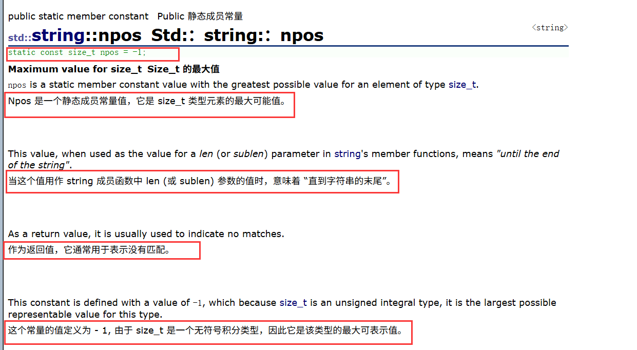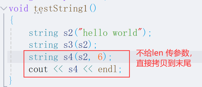 不知道有没有uu注意到size_t len=npos; 这里面的nops是什么? Npos 是一个静态成员常量值,它是 size_t 类型元素的最大可能值。当这个值用作 string 成员函数中 len (或 sublen) 参数的值时,意味着 “直到字符串的末尾”, 也就是说当我们不给len 传参数时,缺省参数就是npos,那就直接拷贝到末尾。 所以上图中的代码,我们也可以这样写: