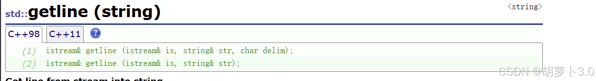 }在平常的使用中,如果使用 cin>>string 读取字符串时,默认是空格和换行作为两个字符串的间隔。而 getline() 能读取一整行的内容,包括空格。默认回车结束,也可以自己指定