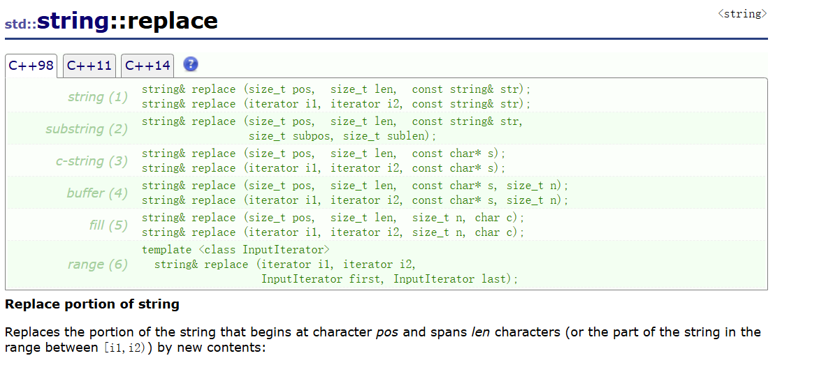 将字符串中以字符 pos 开头并跨 len 字符的部分(或字符串中介于 [i1,i2) 之间的部分]替换为新内容。