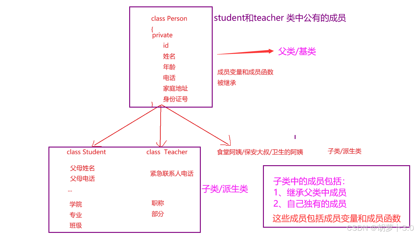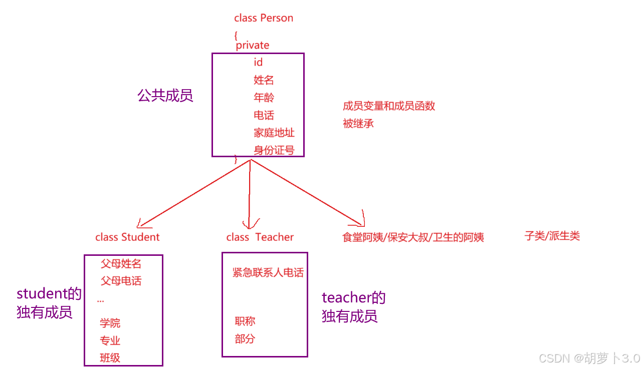 我们将公共的成员都放到 Person类 中,Student和teacher都继承Person,就可以复用这些成员,就不需要重复定义了,省去了很多麻烦