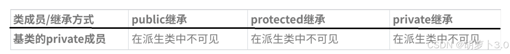 基类的私有成员在派生类都是不可见。基类的其他成员在派生类的访问方式 == Min(成员在基类的访问限定符,继承方式),public > protected >private。