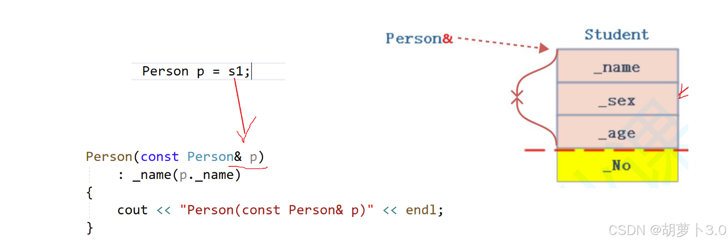派⽣类对象赋值给基类对象是通过基类的拷贝构造函数或者赋值重载函数完成的(这两个函数的细节后面会细讲),这个过程就像派生类自己定义部分成员切掉了⼀样,所以也被叫做切割或者切片